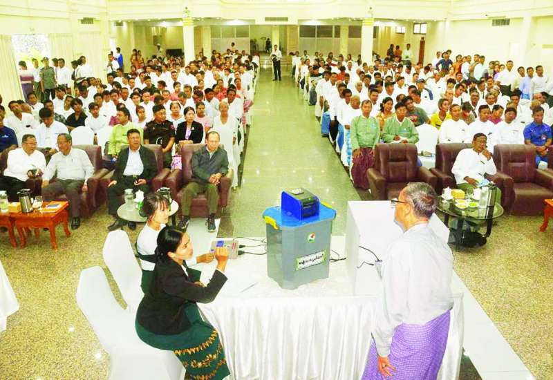 ပြည်ထောင်စုရွေးကောက်ပွဲကော်မရှင်ဥက္ကဋ္ဌ ဦးသန်းစိုးသည် ကော်မရှင်အဖွဲ့ဝင် ဦးအောင်လွင်ဦး၊ ဦးမြင့်ဦး၊ ဦးသန်းအောင်ကျော်၊ တာဝန်ရှိသူများနှင့်အတူ ယနေ့နံနက်ပိုင်းတွင် မဟာအောင်မြေမြို့နယ်၌ မဲဆန္ဒရှင်ပြည်သူများ မြန်မာအီလက်ထရောနစ် မဲပေးစက်(MEVM)ဖြင့် စမ်းသပ်မဲပေးနေမှုကို ကြည့်ရှုပြီး မဲဆန္ဒရှင်များနှင့် တွေ့ဆုံအားပေးစကားပြောကြားသည်။