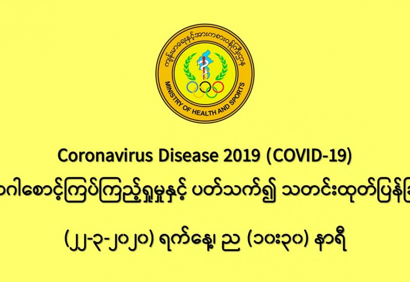 ၁။ ကျန်းမာရေးနှင့်အားကစားဝန်ကြီးဌာန၊ အမျိုးသားကျန်းမာရေး ဓာတ်ခွဲမှုဆိုင်ရာဌာန (ရန်ကုန်) သည် တိုင်းဒေသကြီး/ပြည်နယ် အသီးသီးရှိ ဆေးရုံများတွင် COVID-19 ရောဂါ စောင့်ကြည့်လူနာများအဖြစ် သတ်မှတ်ထားရှိသော လူနာများထံမှ ဓာတ်ခွဲနမူနာများကို ဓာတ်ခွဲ စစ်ဆေးပေးလျက်ရှိပါသည်။
