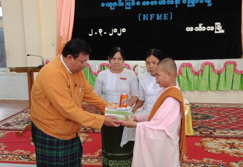 ဧရာဝတီတိုင်းဒေသကြီး ဟင်္သာတမြို့နယ် မြစ်ကွေ့ပရိယတ္တိ စာသင်တိုက်တွင် ဖွင့်လှစ်သင်ကြားလျက်ရှိသည့် ကျောင်းပြင်ပ အလယ်တန်းပညာရေး (NFME) အတွက် ဧရာဝတီတိုင်း ဒေသကြီးအစိုးရ အဖွဲ့က ပညာသင်ထောက်ပံ့ငွေနှင့် ကျောင်းသုံးပစ္စည်းများ ပေးအပ်လှူဒါန်းပွဲ အခမ်းအနားကို ယမန်နေ့ မွန်းလွဲ ၂ နာရီက အဆိုပါကျောင်းတိုက်ရှိ ဘောဇနသီရိ ဆွမ်းစားဆောင်တွင် ကျင်းပပြုလုပ်ခဲ့ကြောင်း သိရသည်။