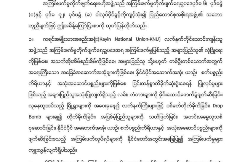 NUG အမည်ခံ ပြည်ဖျက်အကြမ်းဖက်အဖွဲ့၏ လက်ဝေခံ PDF အမည်ခံအကြမ်းဖက်သမားများသည် အစိုးရ၏အုပ်ချုပ်ရေးယန္တရားများ ပျက်စီးစေရန်ရည်ရွယ်၍ တိုင်းရင်းသားလက်နက်ကိုင်အဖွဲ့အချို့နှင့် ပူးပေါင်းကာ အကြမ်းဖက်လုပ်ရပ်များဖြစ်သည့် လုံခြုံရေးအားနည်းသည့် တိုင်းဒေသကြီးနှင့် ပြည်နယ်အချို့ရှိ ဒေသအချို့အား အင်အားသုံးတိုက်ခိုက်ခြင်းများ ပြုလုပ်ပြီး ဒေသခံပြည်သူများ၏ နေအိမ်များ၊ အစိုးရအုပ်ချုပ်မှုအဆောက်အအုံများနှင့် လမ်း၊ တံတားကြီးများအား မီးရှို့ဖျက်ဆီးဖောက်ခွဲခြင်း၊ ပြည်သူများပိုင်ဆိုင်သည့် အဖိုးတန်နှင့် အမြတ်တနိုးပစ္စည်းများအား အတင်းအဓမ္မလုယက်ယူဆောင်ခြင်း၊ လက်နက်များဖြင့် ခြိမ်းခြောက်ခြင်း၊ ဆက်ကြေးကောက်ခြင်း၊ နေ့စဉ် ထမင်း၊ ဟင်း ချက်ပြုတ်၍ ပံ့ပိုးပေးရခြင်း၊ နိုင်ငံ့ဝန်ထမ်းများနှင့် ရဟန်း၊ သံဃာများအား အစိုးရ၊ တပ်နှင့် ရဲသတင်းပေးခေါင်းစဉ်တပ်၍ ဖမ်းဆီးသတ်ဖြတ်ခြင်းများအပါအဝင် အဓမ္မလူသစ်စုဆောင်းခြင်းများ လုပ်ဆောင်လျက်ရှိကြရာ အဆိုပါအကြမ်းဖက်လုပ်ရပ်များကြောင့် ၎င်းတို့ ရောက်ရှိရာ ဒေသများ၌ လမ်းပန်းဆက်သွယ်ရေး၊ စီးပွားရေး၊ ပညာရေး၊ ကျန်းမာရေး စသည်ဖြင့် လူမှုစီးပွားဘဝများ အဘက်ဘက်က ချွတ်ခြုံကျခဲ့ရသည်။