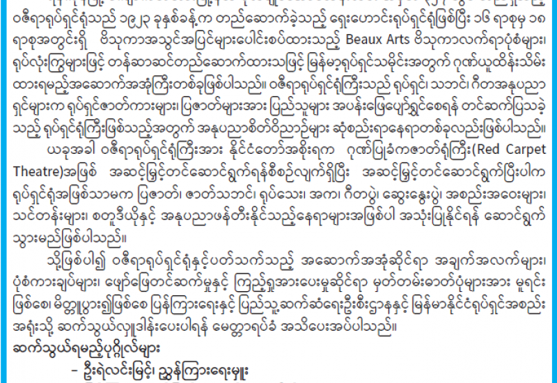 ရန်ကုန်မြို့ ကျောက်တံတားမြို့နယ် ဗိုလ်ချုပ်အောင်ဆန်းလမ်းအမှတ် ၃၂၇ တွင် တည်ရှိသည့် ဝဇီရာရုပ်ရှင်ရုံသည် ၁၉၂၃ ခုနှစ်ခန့်က တည်ဆောက်ခဲ့သည့် ရှေးဟောင်းရုပ်ရှင်ရုံဖြစ်ပြီး ၁၆ ရာစုမှ ၁၈ ရာစုအတွင်းရှိ ဗိသုကာအသွင်အပြင်များပေါင်းစပ်ထားသည့် Beaux Arts ဗိသုကာလက်ရာပုံစံများ၊ ရုပ်လုံးကြွများဖြင့် တန်ဆာဆင်တည်ဆောက်ထားသဖြင့် မြန်မာ့ရုပ်ရှင်သမိုင်းအတွက် ဂုဏ်ယူထိန်းသိမ်း ထားရမည့်အဆောက်အအုံကြီးတစ်ခုဖြစ်ပါသည်။ ဝဇီရာရုပ်ရှင်ရုံကြီးသည် ရုပ်ရှင်၊ သဘင်၊ ဂီတအနုပညာရှင်များက ရုပ်ရှင်ဇာတ်ကားများ၊ ပြဇာတ်များအား ပြည်သူများ အပန်းဖြေပျော်ရွှင်စေရန် တင်ဆက်ပြသခဲ့သည့် ရုပ်ရှင်ရုံကြီးဖြစ်သည့်အတွက် အနုပညာစိတ်ဝိညာဉ်များ ဆုံစည်းရာနေရာတစ်ခုလည်း ဖြစ်ပါသည်။