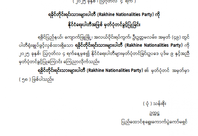 ရခိုင်တိုင်းရင်းသားများပါတီ (Rakhine Nationalities Party) ကို နိုင်ငံရေးပါတီအဖြစ် မှတ်ပုံတင်ခွင့်ပြုခြင်း