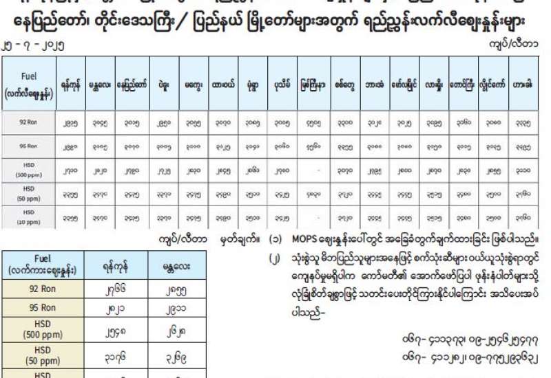 ရန်ကုန်မြို့နှင့် မန္တလေးမြို့အတွက် ရည်ညွှန်းလက်ကားဈေးနှုန်းများနှင့် ပြည်ထောင်စုနယ်မြေ နေပြည်တော်၊ တိုင်းဒေသကြီး/ပြည်နယ် မြို့တော်များအတွက် ရည်ညွှန်းလက်လီဈေးနှုန်းများ