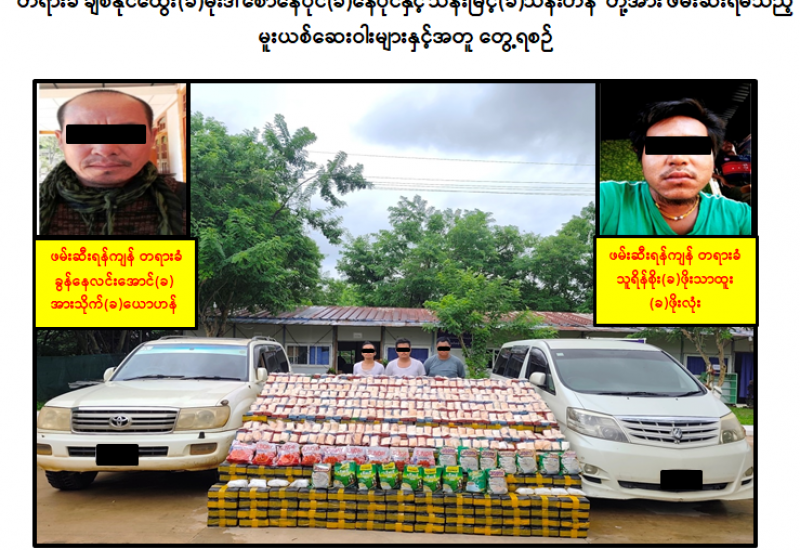 လုံခြုံရေးတပ်ဖွဲ့ဝင်များ ပါဝင်သော ပူးပေါင်းအဖွဲ့သည် ဇူလိုင်လ ၁၁ ရက်နေ့ နံနက် ၈ နာရီခွဲအချိန် လယ်ဝေးမြို့နယ်၊ သစ်ကြိမ်းကျေးရွာအုပ်စု၊ ကြာကန်ကျေးရွာအနီးတွင် အောင်နန်းချိုကျေးရွာဘက်မှ တောင်စဉ်အေးရွာဘက်သို့ စောနေပိုင် (ခ) နေပိုင် မောင်းနှင်လာသော LAND CRUSIER မော်တော်ယာဉ်နှင့် ရှေ့နောက်လိုက်ပါလာသည့် ချစ်နိုင်ထွေး (ခ) မိုးဒီ မောင်းနှင်လာသော ALPHARD မော်တော်ယာဉ်တို့အား စစ်ဆေးရှာဖွေရာ အဆိုပါယာဉ် ၂ စီးပေါ်မှ ဘိန်းဖြူ ၆၇ ဒသမ ၃၃ ကီလို (၎င်းဒေသတန်ဖိုးငွေကျပ် ၁ ဒသမ ၆၈၃၂၅ ဘီလီယံ) ဖမ်းဆီးရမိခဲ့ကြောင်း၊ ကွင်းဆက်ဖော်ထုတ်ချက်အရ အဆိုပါဘိန်းဖြူများအား လက်ခံ၍ မန္တလေးသို့ တာဝန်ခံသယ်ဆောင်သူ သိန်းမြင့် (ခ) သိန်းဟန်သည် တာချီလိတ်ဘက်သို့ တိမ်းရှောင်သွားကြောင်း သိရှိရသဖြင့် ဖော်ထုတ်ဖမ်းဆီးရမိရေး ဆောင်ရွက်ခဲ့ရာ ဇူလိုင်လ ၁၂ ရက်နေ့ နံနက် ၇ နာရီခွဲအချိန်တွင် တာချီလိတ်မြို့၊ ဝမ်ကောင်းရပ်ကွက်၊ ဗိုလ်ချုပ်လမ်းတွင် ဖမ်းဆီးရမိခဲ့ကြောင်း၊