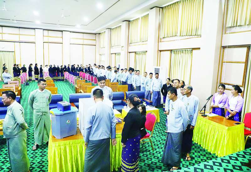 မြန်မာအီလက်ထရောနစ် မဲပေးစက် (MEVM) နှင့် စပ်လျဉ်း၍ ရှင်းလင်းပြသခြင်းနှင့် လက်တွေ့စမ်းသပ်မဲပေးခြင်းကို ယနေ့မွန်းလွဲပိုင်းတွင် နေပြည်တော်ရှိ ရုံးအမှတ် (၅၇) အခွန်အယူခံခုံအဖွဲ့ရုံး စုပေါင်းခန်းမ၌ ပြုလုပ်ရာ ပြည်ထောင်စုရွေးကောက်ပွဲကော်မရှင်အဖွဲ့ဝင် ဦးမျိုးလှိုင်၊ အခွန်အယူခံခုံအဖွဲ့ဥက္ကဋ္ဌ ဦးမြင့်ဦး၊ အခွန်အယူခံခုံအဖွဲ့ အဖွဲ့ဝင်များ၊ ပြည်ထောင်စုရွေးကောက်ပွဲကော်မရှင်အဖွဲ့မှ တာဝန်ရှိသူများနှင့် အခွန်အယူခံခုံအဖွဲ့ရုံးရှိ အရာထမ်း၊ အမှုထမ်းများ တက် ရောက်ကြသည်။