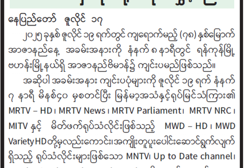 ၂၀၂၅ ခုနှစ် (၇၈) နှစ်မြောက် အာဇာနည်နေ့ အခမ်းအနား MRTV မှ တိုက်ရိုက်ထုတ်လွှင့်မည်