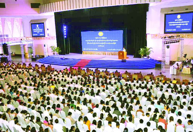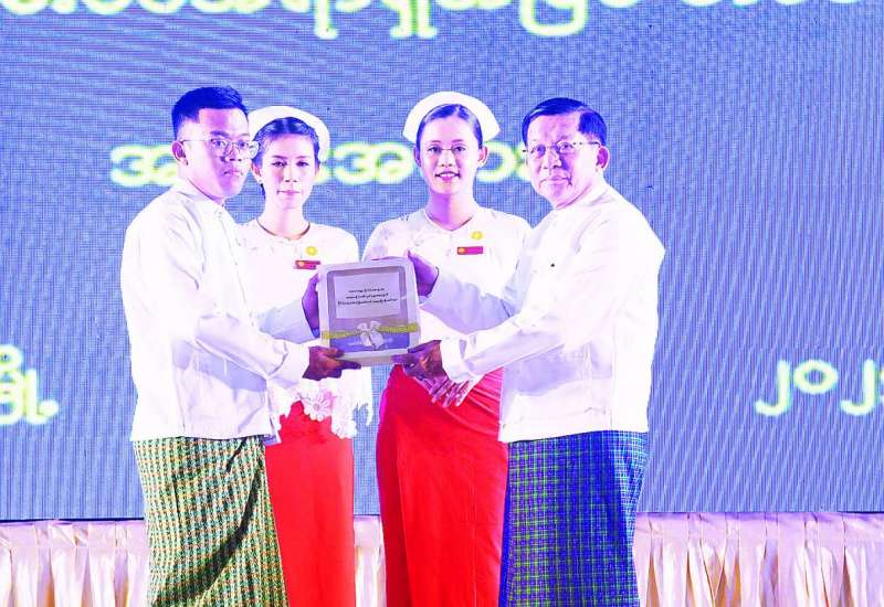 ကျန်းမာရေးဝန်ကြီးဌာန ဆရာဝန် (သစ်လွင်) များနှင့် သွားနှင့်ခံတွင်းဆရာဝန် (သစ်လွင်) များအား နိုင်ငံ့ဝန်ထမ်း ပြန်တမ်းဝင်အရာရှိအဖြစ် တာဝန်ပေးအပ်ခြင်းခန့်အပ်လွှာ ပေးအပ်ပွဲအခမ်းအနားအား ယနေ့နံနက်ပိုင်းတွင် ရန်ကုန်မြို့ရှိ မြန်မာကွန်ဗင်းရှင်းစင်တာ (ရန်ကုန်မြို့) ၌ ကျင်းပပြုလုပ်ရာ နိုင်ငံတော်စီမံအုပ်ချုပ်ရေးကောင်စီဥက္ကဋ္ဌ နိုင်ငံတော်ဝန်ကြီးချုပ် ဗိုလ်ချုပ်မှူးကြီး မင်းအောင်လှိုင် တက်ရောက်အမှာစကားပြောကြားသည်။