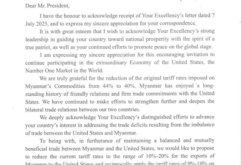 အမေရိကန်သမ္မတ ဒေါ်နယ်ထရမ့်က မြန်မာနိုင်ငံအပါအဝင် ဂျပန်၊ တောင်ကိုရီးယား၊ မလေးရှား၊ ကာဇက်စတန်၊ တူနီးရှား၊ ဘောစနီးယား ဟာဇီဂိုးဗီးနား၊ တောင်အာဖရိက၊ အင်ဒိုနီးရှား၊ ဘဂ်လားဒေ့ရှ်၊ ဆားဘီးယား၊ ကမ္ဘောဒီးယား၊ ထိုင်း၊ လာအိုစသည့် စုစုပေါင်းနိုင်ငံ ၁၄ နိုင်ငံအား သွင်းကုန်ခွန်တိုးမြှင့်စည်းကြပ်ထားမှုနှင့် ပတ်သက်၍ ဇူလိုင် ၇ ရက်နေ့တွင် သက်ဆိုင်ရာနိုင်ငံများသို့ သဝဏ်လွှာ/အကြောင်းကြားစာများ ပေးပို့ခဲ့သည်။