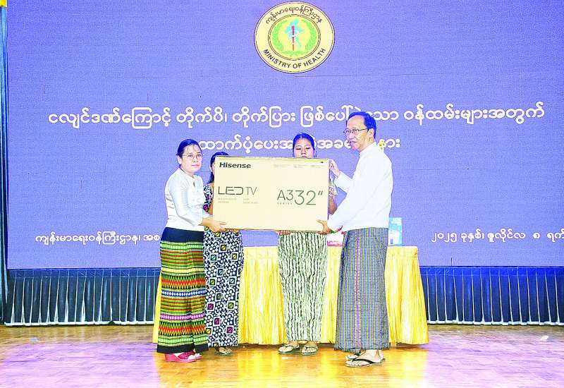 ကျန်းမာရေးဝန်ကြီးဌာန ဝန်ထမ်းမိသားစုများအနက် နေပြည်တော်ကောင်စီနယ်မြေ၌ မန္တလေးငလျင်ကြီးကြောင့် မြေညီထပ်အခန်းများပျက်စီးခဲ့သည့် ကျန်းမာရေးဝန်ထမ်းမိသားစုများ အခြေခံလိုအပ်သည့် အိမ်သုံးလျှပ်စစ်ပစ္စည်းများ ထောက်ပံ့ပေးအပ်ခြင်းအခမ်းအနားကို ယမန်နေ့ မွန်းလွဲပိုင်းတွင် နေပြည်တော်ကျန်းမာရေးဝန်ကြီးဌာန ရုံးအမှတ် (၄) အစည်းအဝေးခန်းမ၌ ကျင်းပသည်။