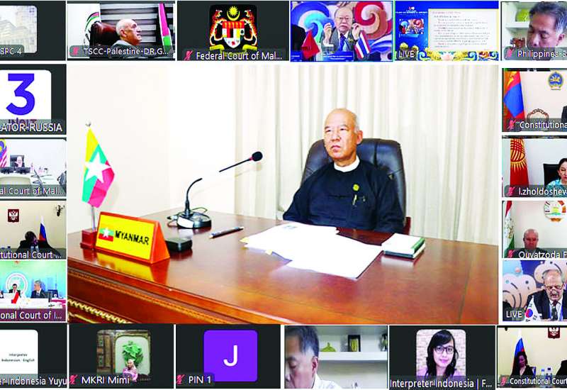 နိုင်ငံတော်ဖွဲ့စည်းပုံအခြေခံဥပဒေဆိုင်ရာခုံရုံးဥက္ကဋ္ဌ ဦးအောင်ဇော်သိန်းသည် ထိုင်းဘုရင့်နိုင်ငံ ဗန်ကောက်မြို့တွင် Video Conferencing စနစ်ဖြင့်ပြုလုပ်သည့် အာရှဖွဲ့စည်းပုံအခြေခံ ဥပဒေဆိုင်ရာတရားရုံးများနှင့် အဆင့်တူအဖွဲ့အစည်းများအသင်း (Association of Asian Constit-utional Courts and Equivalent Institutions -AACC) ၏ ဘုတ် အဖွဲ့ဝင်နိုင်ငံများ အစည်းအဝေးနှင့် စာတမ်းဖတ်ပွဲသို့ တက်ရောက်သည်။