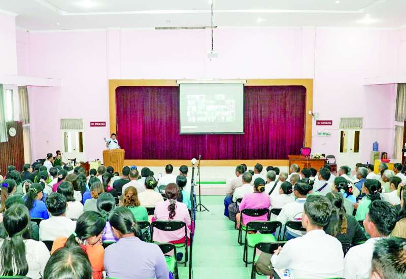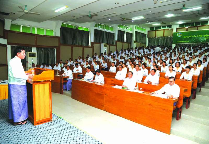ကျန်းမာရေးဝန်ကြီးဌာန ပြည်ထောင်စုဝန်ကြီး ပါမောက္ခဒေါက်တာ သက်ခိုင်ဝင်းသည် ယနေ့တွင် ရန်ကုန်ပြည်သူ့ဆေးရုံကြီး Training Center ၌ကျင်းပသော (Urban Health Center-UHC) ဒေသန္တရကျန်းမာရေးဌာနများတွင် ကျန်းမာရေးစောင့်ရှောက်မှုလုပ်ငန်းများ တိုးမြှင့်ဆောင်ရွက်နိုင်ရေး လုပ်ငန်းညှိနှိုင်းအစည်းအဝေးသို့ တက်ရောက်အမှာစကားပြောကြားသည်။