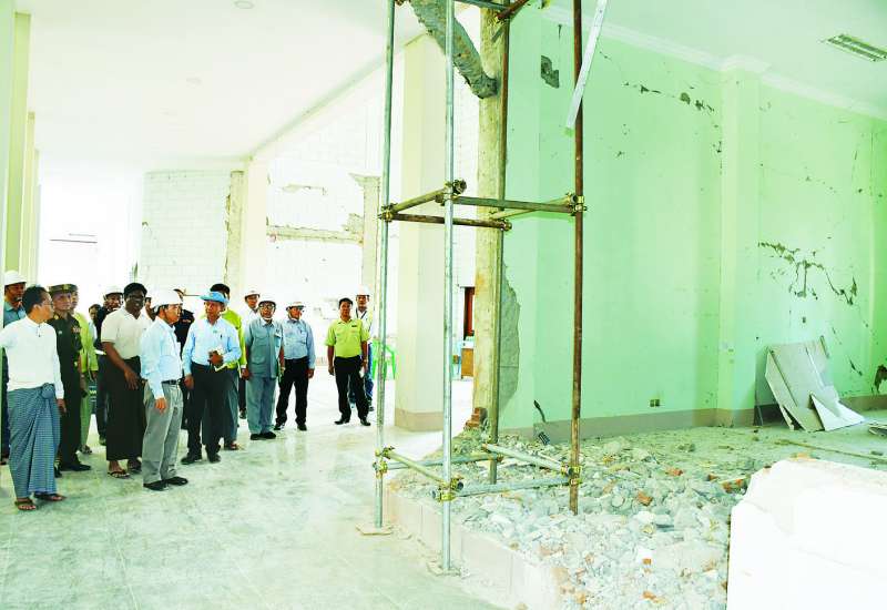 နေပြည်တော်ကောင်စီဥက္ကဋ္ဌ ဦးသန်းထွန်းဦးသည် ယမန်နေ့ ညနေပိုင်းက နေပြည်တော်စည်ပင်သာယာရေးကော်မတီ ဒုတိယမြို့တော်ဝန်နှင့်အတူ ငလျင်ဘေးဒဏ်ကြောင့် ထိခိုက်ပျက်စီးခဲ့သည့် နေပြည်တော်စည်ပင်သာယာရေးကော်မတီ၊ မြို့တော်ခန်းမအဆောက်အအုံ ပြန်လည်ပြုပြင်နေမှုအခြေအနေများကို ကြည့်ရှုစစ်ဆေးပြီး ထိခိုက်ပျက်စီးသည့် အစိတ်အပိုင်းများအား စနစ်တကျဖယ်ရှားရှင်းလင်းရေး၊ သတ်မှတ်စံချိန်စံညွှန်းများနှင့်အညီ လုပ်ငန်းများ အမြန်ပြီးစီးအောင် ပြုပြင်ဆောင်ရွက်ရေးတို့ကို မှာကြားသည်။