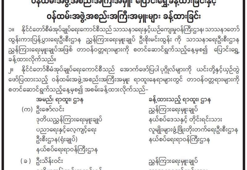 ဝန်ထမ်းအဖွဲ့အစည်းအကြီးအမှူး ပြောင်းရွှေ့ခန့်ထားခြင်းနှင့် ဝန်ထမ်းအဖွဲ့အစည်းအကြီးအမှူးများ ခန့်ထားခြင်း