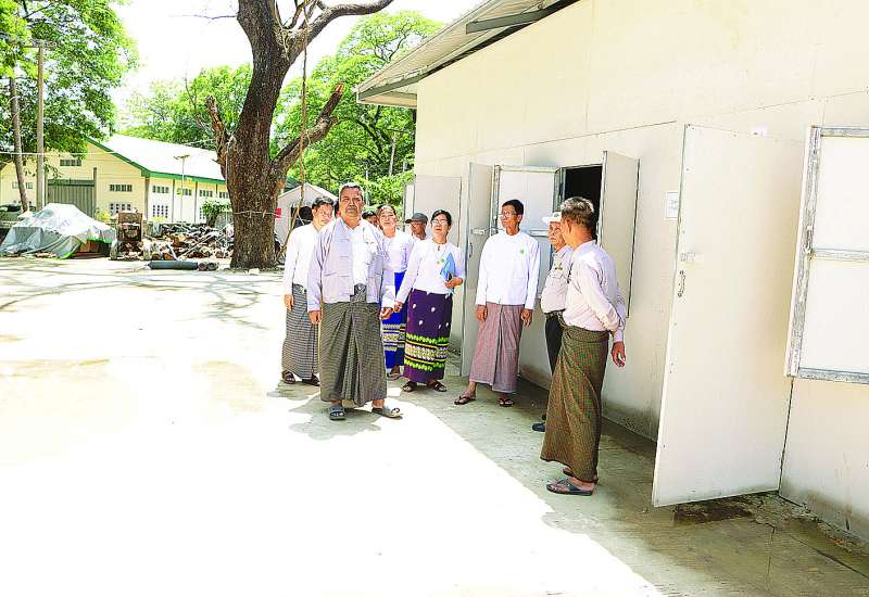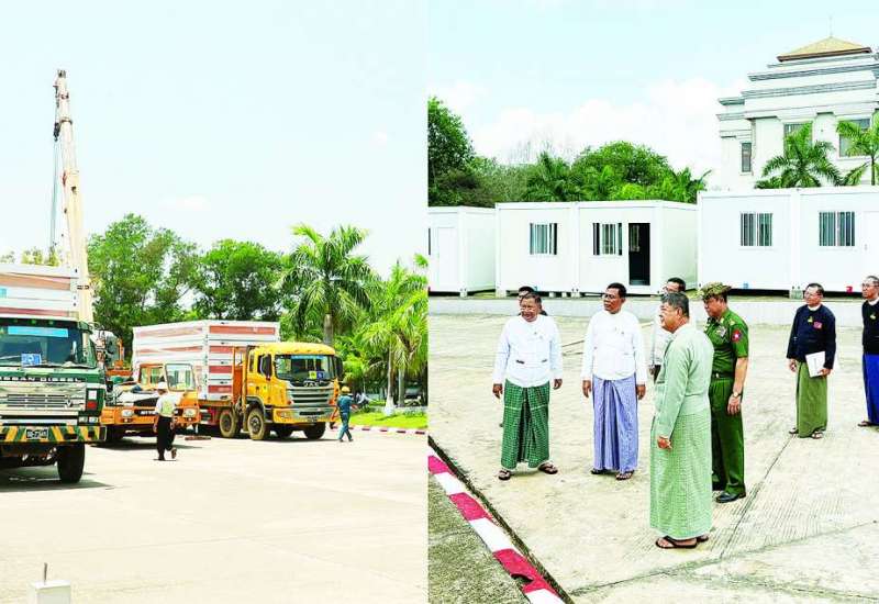အမျိုးသားသဘာဝဘေးအန္တရာယ်ဆိုင်ရာစီမံခန့်ခွဲမှုကော်မတီ ဒုတိယဥက္ကဋ္ဌများဖြစ်ကြသည့် ပြည်ထဲရေးဝန်ကြီးဌာန ပြည်ထောင်စုဝန်ကြီး ဒုတိယဗိုလ်ချုပ်ကြီး ထွန်းထွန်းနောင်နှင့် လူမှုဝန်ထမ်း၊ ကယ်ဆယ်ရေးနှင့် ပြန်လည်နေရာချထားရေးဝန်ကြီးဌာန ပြည်ထောင်စုဝန်ကြီး ဒေါက်တာစိုးဝင်း၊ ကော်မတီအဖွဲ့ဝင် ဆောက်လုပ်ရေးဝန်ကြီးဌာန ပြည်ထောင်စုဝန်ကြီး ဦးမျိုးသန့်တို့သည် တာဝန်ရှိသူများလိုက်ပါ၍ ယနေ့နံနက်ပိုင်းတွင် ဥပဒေရေးရာဝန်ကြီးဌာန၊ ပြည်ထောင်စုတရားလွှတ်တော်ချုပ်ရုံးနှင့် နိုင်ငံခြားရေးဝန်ကြီးဌာနတို့၌ Prefabricated Office များ တပ်ဆင်ပြီးစီးမှုအခြေအနေများနှင့် တပ်ဆင်လျက်ရှိသည့်အခြေအနေများကို လိုက်လံကြည့်ရှုစစ်ဆေးကြသည်။
