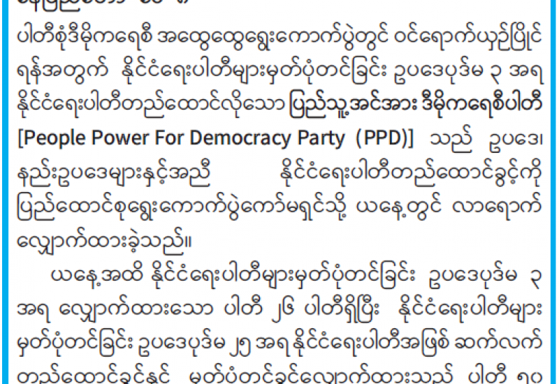 ပါတီစုံဒီမိုကရေစီအထွေထွေရွေးကောက်ပွဲတွင် ဝင်ရောက်ယှဉ်ပြိုင်ရန်အတွက် နိုင်ငံရေးပါတီများမှတ်ပုံတင်ခြင်း ဥပဒေပုဒ်မ ၃ အရ နိုင်ငံရေးပါတီတည်ထောင်လိုသော ပြည်သူ့အင်အား ဒီမိုကရေစီပါတီ [People Power For Democracy Party (PPD)] သည် ဥပဒေ၊ နည်းဥပဒေများနှင့်အညီ နိုင်ငံရေးပါတီတည်ထောင်ခွင့်ကို ပြည်ထောင်စုရွေးကောက်ပွဲကော်မရှင်သို့ ယနေ့တွင် လာရောက်လျှောက်ထားခဲ့သည်။