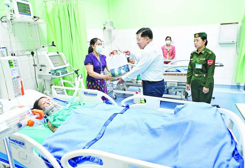 နိုင်ငံတော်စီမံအုပ်ချုပ်ရေးကောင်စီဥက္ကဋ္ဌ နိုင်ငံတော်ဝန်ကြီးချုပ် ဗိုလ်ချုပ်မှူးကြီး မင်းအောင်လှိုင် သည် ဇနီး ဒေါ်ကြူကြူလှ၊ ခရီးစဉ်တွင်လိုက်ပါလာသည့်အဖွဲ့ဝင်များနှင့် တာဝန်ရှိသူများလိုက်ပါ၍ ယနေ့နံနက်ပိုင်းတွင် ပြင်ဦးလွင်မြို့၊ တပ်မတော်ဆေးရုံသို့ သွားရောက်၍ ဆေးရုံတက်ရောက် ကုသမှုခံယူလျက်ရှိသည့် ငလျင်ဘေးဒဏ်ကြောင့် ထိခိုက်ဒဏ်ရာရရှိခဲ့သူများနှင့် အရာရှိ၊ စစ်သည်များ၊ မိသားစုဝင်များ၊ မြန်မာနိုင်ငံရဲတပ်ဖွဲ့ဝင်များ၏ ကျန်းမာရေးစောင့်ရှောက်မှု ပေးထားသည့် အခြေအနေများကို သွားရောက်ကြည့်ရှုအားပေးသည်။