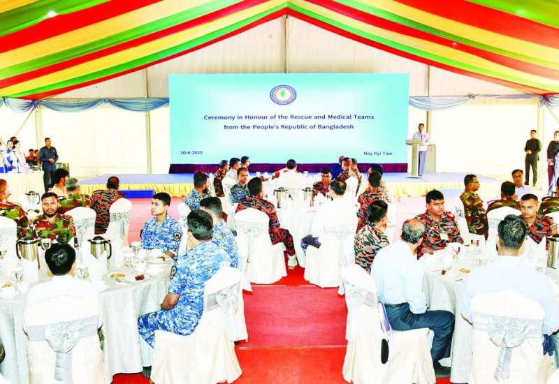 မတ် ၂၈ ရက်တွင် ဖြစ်ပွားခဲ့သည့် ပြင်းထန်ငလျင်နှင့် နောက်ဆက်တွဲငလျင်များကြောင့် ပျက်စီးဆုံးရှုံးမှုများဖြစ်ပေါ်ခဲ့သည့် မြန်မာနိုင်ငံသို့ အရေးပေါ်ကူညီကယ်ဆယ်ရေးလုပ်ငန်းများ လာရောက်လုပ်ဆောင်ခဲ့ပြီး ကယ်ဆယ်ရေးလုပ်ငန်းစဉ်များ ပြီးမြောက်သဖြင့် ဘင်္ဂလားဒေ့ရှ်နိုင်ငံသို့ ပြန်လည်ထွက်ခွာမည့် ဘင်္ဂလားဒေ့ရှ်နိုင်ငံ ရှာဖွေကယ်ဆယ်ရေးနှင့် အရေးပေါ်ကျန်းမာရေးစောင့်ရှောက်မှုအဖွဲ့အား ဂုဏ်ပြုနှုတ်ဆက်ခြင်းအခမ်းအနားကို ယနေ့နံနက်ပိုင်းတွင် နေပြည်တော်ရှိ တပေါင်းကွင်း၌ ကျင်းပပြုလုပ်ရာ အမျိုးသားသဘာဝဘေးအန္တရာယ်ဆိုင်ရာ စီမံခန့်ခွဲမှုကော်မတီဥက္ကဋ္ဌ နိုင်ငံတော်စီမံအုပ်ချုပ်ရေးကောင်စီ ဒုတိယဥက္ကဋ္ဌ ဒုတိယဝန်ကြီးချုပ် ဒုတိယဗိုလ်ချုပ်မှူးကြီး စိုးဝင်း တက်ရောက်၍ ကျေးဇူးတင်ဂုဏ်ပြုအမှာစကားပြောကြားသည်။