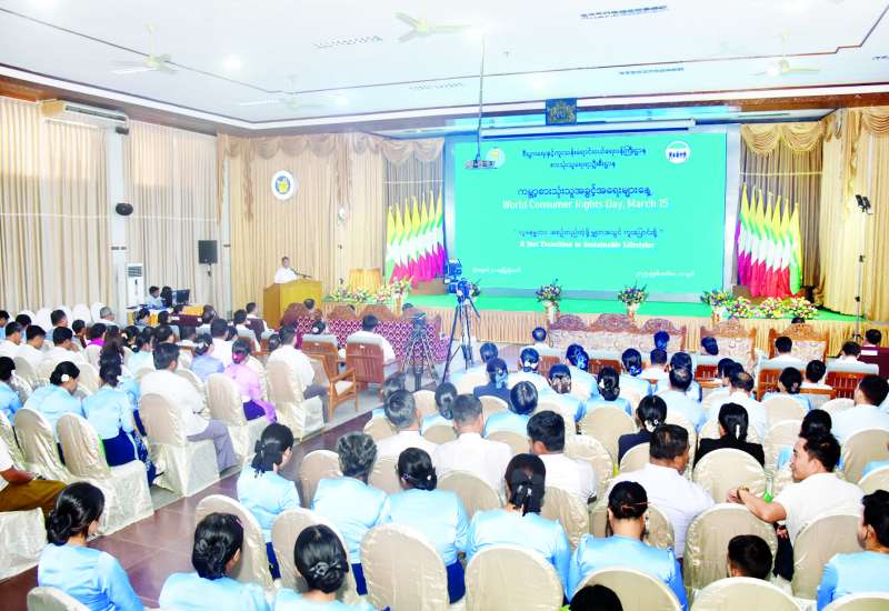 စီးပွားရေးနှင့်ကူးသန်းရောင်းဝယ်ရေးဝန်ကြီးဌာန စားသုံးသူရေးရာဦးစီးဌာန ရန်ကုန်တိုင်းဒေသကြီး ဦးစီးမှူးရုံးကကြီးမှူးကျင်းပသည့် ၂၀၂၅ ခုနှစ် ကမ္ဘာ့စားသုံးသူအခွင့်အရေးများနေ့ (World Consumer Rights Day) အခမ်းအနားကို “လူနေမှုဘဝ အစဉ်တည်တံ့ဖို့ မျှတအသွင် ကူးပြောင်းစို့” ဆောင်ပုဒ်နှင့်အညီ ယနေ့နံနက် ၁၀ နာရီတွင် ရန်ကုန်မြို့ မြန်မာနိုင်ငံကုန်သည်များနှင့် စက်မှုလက်မှုလုပ်ငန်းရှင်များ အသင်းချုပ်မင်္ဂလာခန်းမ၌ ကျင်းပသည်။