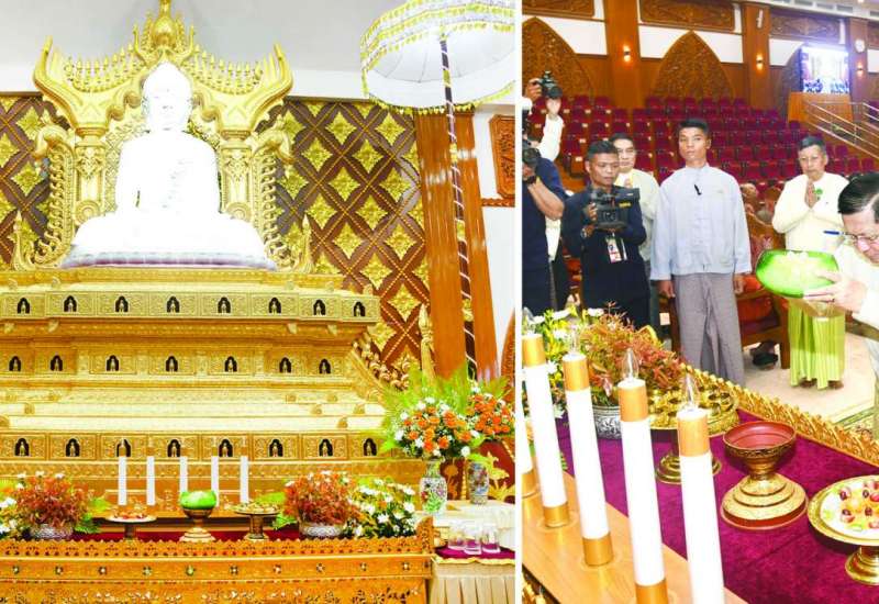 ၂၀၂၅ ခုနှစ်၊ သာသနာတော်ဆိုင်ရာ ဘွဲ့တံဆိပ်တော် ဆက်ကပ်ခံယူတော်မူမည့် ဆရာတော်ကြီးများအား နိုင်ငံတော်စီမံအုပ်ချုပ်ရေးကောင်စီဥက္ကဋ္ဌ နိုင်ငံတော်ဝန်ကြီးချုပ် ဗိုလ်ချုပ်မှူးကြီးမင်းအောင်လှိုင်နှင့်ဇနီး ဒေါ်ကြူကြူလှတို့က ယနေ့နံနက်ပိုင်းတွင် နေပြည်တော်မာရဝိဇယဗုဒ္ဓဥယျာဉ်တော် ပရိဝုဏ်အတွင်းရှိ အဂ္ဂါဓိပတိသာသနာ့ဗိမာန်တော်ကြီး၌ နေ့ဆွမ်းဆက်ကပ်လှူဒါန်းသည်။