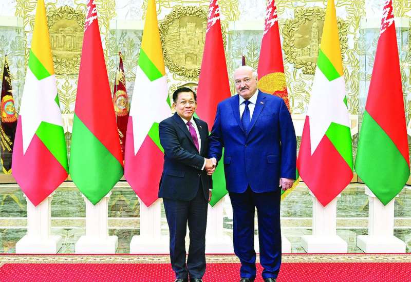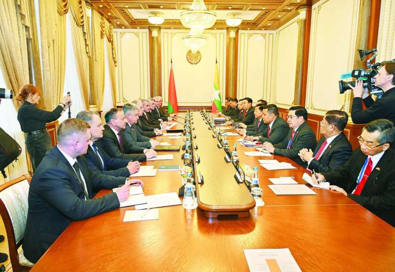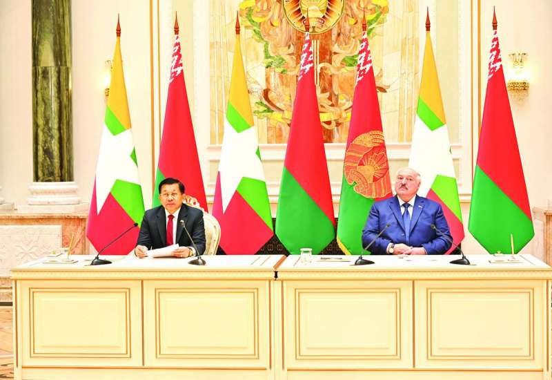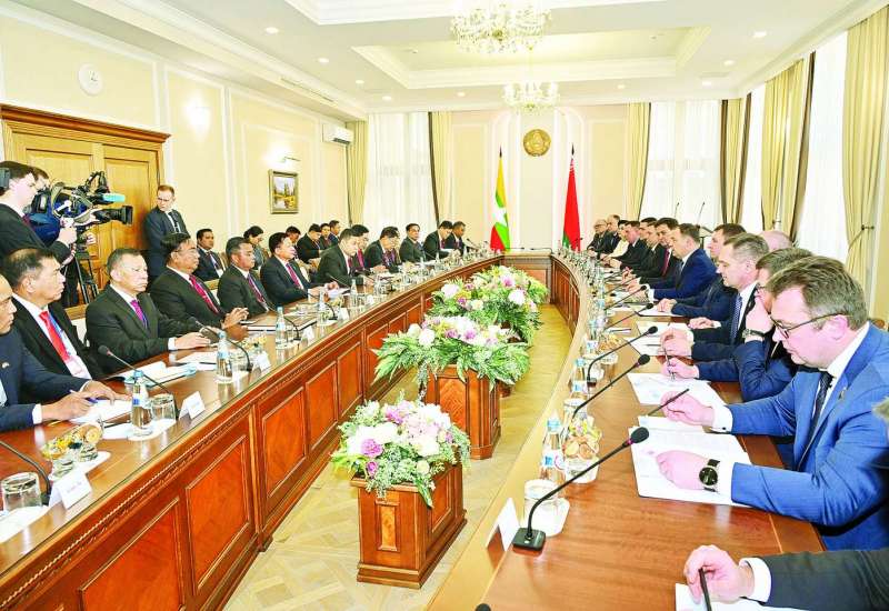မြန်မာ-ဘယ်လာရုစ် နှစ်နိုင်ငံ နိုင်ငံတော်အဆင့်တွေ့ဆုံဆွေးနွေးပွဲကို ယနေ့ဒေသစံတော်ချိန် မွန်းလွဲပိုင်းတွင် ဘယ်လာရုစ်နိုင်ငံ မင့်စ်မြို့ရှိ သမ္မတနန်းတော်အစည်းအဝေးခန်းမ၌ ကျင်းပပြုလုပ်ရာ နိုင်ငံတော်စီမံအုပ်ချုပ်ရေးကောင်စီဥက္ကဋ္ဌ နိုင်ငံတော်ဝန်ကြီးချုပ် ဗိုလ်ချုပ်မှူးကြီး မင်းအောင်လှိုင်နှင့် ဘယ်လာရုစ်သမ္မတနိုင်ငံသမ္မတ H.E. Mr. Alexander Gregoryevich Lukashenko တို့ တက်ရောက်ဆွေးနွေးကြသည်။