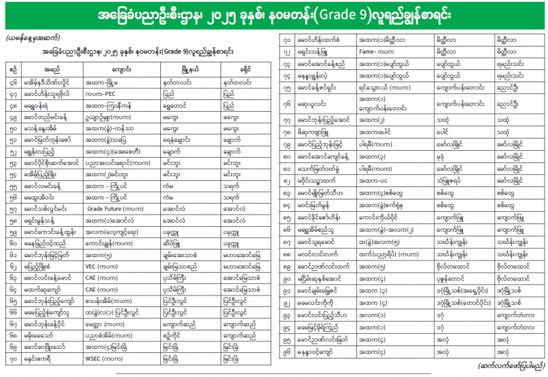 အခြေခံပညာဦးစီးဌာန၊ ၂၀၂၅ ခုနှစ်၊ နဝမတန်း(Grade 9)လူရည်ချွန်စာရင်း