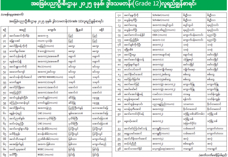 အခြေခံပညာဦးစီးဌာန၊ ၂၀၂၅ ခုနှစ်၊ ဒွါဒသမတန်း(Grade 12)လူရည်ချွန်စာရင်း