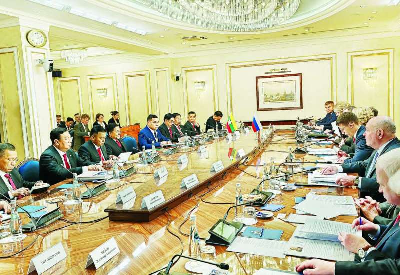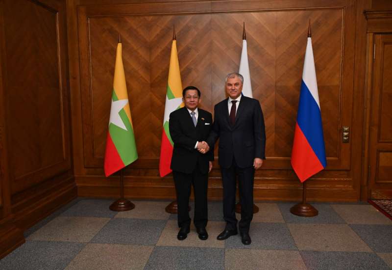 ရုရှားဖက်ဒရေးရှင်းနိုင်ငံ၊ မော်စကိုမြို့သို့ တရားဝင်ချစ်ကြည်ရေးခရီးရောက်ရှိနေသည့် နိုင်ငံတော်စီမံအုပ်ချုပ်ရေးကောင်စီဥက္ကဋ္ဌ၊ နိုင်ငံတော်ဝန်ကြီးချုပ် ဗိုလ်ချုပ်မှူးကြီး မင်းအောင်လှိုင်သည် ယနေ့နံနက်ပိုင်းတွင် ဒူးမားလွှတ်တော်ဥက္ကဋ္ဌ H.E. Mr. Vyacheslav Volodin နှင့် ဒူးမားလွှတ်တော်အဆောက်အဦ အစည်းအဝေးခန်းမ၌ တွေ့ဆုံဆွေးနွေးသည်။