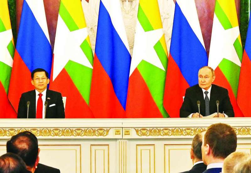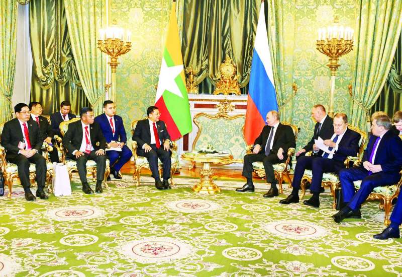 ရုရှားဖက်ဒရေးရှင်းနိုင်ငံသမ္မတ H.E. Vladimir Vladimirovich Putin ၏ ဖိတ်ကြားချက်အရ ရုရှားဖက်ဒရေးရှင်းနိုင်ငံသို့ တရားဝင်ချစ်ကြည်ရေးခရီးရောက်ရှိနေသည့် နိုင်ငံတော်စီမံအုပ်ချုပ်ရေးကောင်စီဥက္ကဋ္ဌ နိုင်ငံတော်ဝန်ကြီးချုပ် ဗိုလ်ချုပ်မှူးကြီး မင်းအောင်လှိုင်သည် ယနေ့ဒေသစံတော်ချိန် ညနေပိုင်းတွင် မော်စကိုမြို့၊ ကရင်မလင်နန်းတော်၌ ရုရှားဖက်ဒရေးရှင်းနိုင်ငံသမ္မတ H.E. Vladimir Vladimirovich Putin နှင့် သီးခြားတွေ့ဆုံဆွေးနွေးသည်။