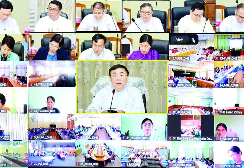 ပညာရေးဝန်ကြီးဌာန ပြည်ထောင်စုဝန်ကြီး ဒေါက်တာညွန့်ဖေသည် တက္ကသိုလ်ပါမောက္ခချုပ်များ၊ ပညာရေးဒီဂရီကောလိပ် ကျောင်းအုပ်ကြီးများ၊ တိုင်းဒေသကြီးနှင့် ပြည်နယ်ပညာရေးမှူးများနှင့် တွေ့ဆုံပွဲကို ယနေ့မွန်းလွဲပိုင်းတွင် နေပြည်တော်ပညာရေးဝန်ကြီးဌာန ရုံးအမှတ်(၁၃)ရှိ အစည်းအဝေးခန်းမ၌ ကျင်းပရာ ဒုတိယဝန်ကြီးများဖြစ်ကြသည့် ဒေါက်တာဇော်မြင့်နှင့် ဦးနေမျိုးလှိုင်၊ ဦးစီးဌာနများမှ ညွှန်ကြားရေးမှူးချုပ်များ၊ ဒုတိယညွှန်ကြားရေးမှူးချုပ်များနှင့် တာဝန်ရှိသူများ တက်ရောက်ကြပြီး တက္ကသိုလ်ပါမောက္ခချုပ်များ၊ ပညာရေးဒီဂရီကောလိပ် ကျောင်းအုပ်ကြီးများ၊ တိုင်းဒေသကြီးနှင့်ပြည်နယ် ပညာရေးမှူးများက ဗီဒီယိုကွန်ဖရင့်စနစ်ဖြင့် တက်ရောက်သည်။