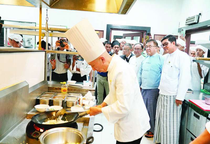 မြန်မာ - တရုတ် သံတမန်ထူထောင်ခြင်း (၇၅) နှစ်မြောက်အထိမ်းအမှတ်အဖြစ် ဟိုတယ်နှင့်ခရီးသွားလာရေးဝန်ကြီးဌာန မြန်မာ - တရုတ်ချစ်ကြည်ရေးအသင်း (မန္တလေး) နှင့် ဖူးကျင့်နိုင်ငံတကာဘာသာစကား သင်တန်းကျောင်းတို့ ပူးပေါင်း၍ Yunnan Economics Trade and Foreign Affairs College ၏ အကူအညီဖြင့် တရုတ်အစားအစာချက်ပြုတ်နည်းသင်တန်းဖွင့်ပွဲအခမ်းအနားကို ယနေ့မွန်းလွဲပိုင်းတွင် နေပြည်တော်ရှိ ရွှေစံအိမ်ဟိုတယ်၌ ကျင်းပပြုလုပ်ရာ ဟိုတယ်နှင့်ခရီးသွားလာရေးဝန်ကြီဌာန ပြည်ထောင်စုဝန်ကြီး ဦးကျော်စိုးဝင်း တက်ရောက်၍ အဖွင့်အမှာစကားပြောကြားသည်။