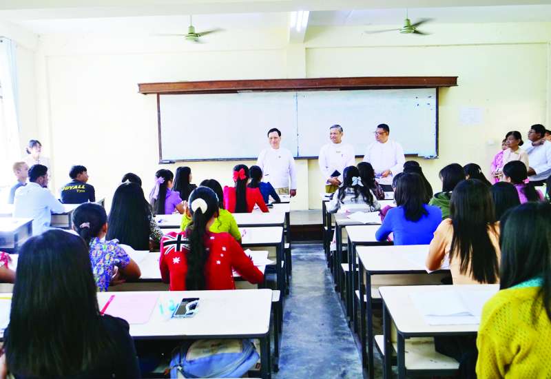 ပညာရေးဝန်ကြီးဌာန ဒုတိယဝန်ကြီး ဒေါက်တာဇော်မြင့်သည် တာဝန်ရှိသူများနှင့်အတူ ယမန်နေ့နံနက်ပိုင်းတွင် ရန်ကုန်အရှေ့ပိုင်းတက္ကသိုလ်သို့ ရောက်ရှိပြီး စာသင်ခန်းများတွင် ကျောင်းသား ကျောင်းသူများ အေးချမ်းပျော်ရွှင်စွာ ပညာသင်ယူနေမှုကို လှည့်လည်ကြည့်ရှုအားပေးကာ မိမိတို့ ရှေ့ဘဝသာယာလှပရေးအတွက် ရည်မှန်းချက်ချမှတ်ကြိုးစားကြရန် တိုက်တွန်းမှာကြားသည်။