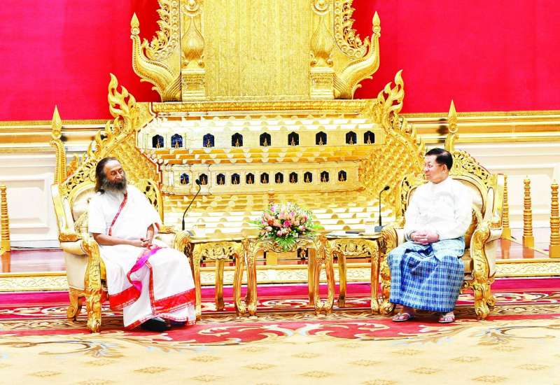 နိုင်ငံတော်စီမံအုပ်ချုပ်ရေးကောင်စီဥက္ကဋ္ဌ နိုင်ငံတော်ဝန်ကြီးချုပ် ဗိုလ်ချုပ်မှူးကြီး မင်းအောင်လှိုင်သည် အိန္ဒိယနိုင်ငံမှ လူသားချင်းစာနာထောက်ထားမှုခေါင်းဆောင်နှင့် ငြိမ်းချမ်းရေးသံတမန်ကြီး Gurudev Sri Sri Ravi Shankar အား ယနေ့နံနက်ပိုင်းတွင် နေပြည်တော်ရှိ နိုင်ငံတော်စီမံအုပ်ချုပ်ရေးကောင်စီဥက္ကဋ္ဌရုံး သံတမန်ဆောင်ဧည့်ခန်းမ၌ လက်ခံတွေ့ဆုံသည်။