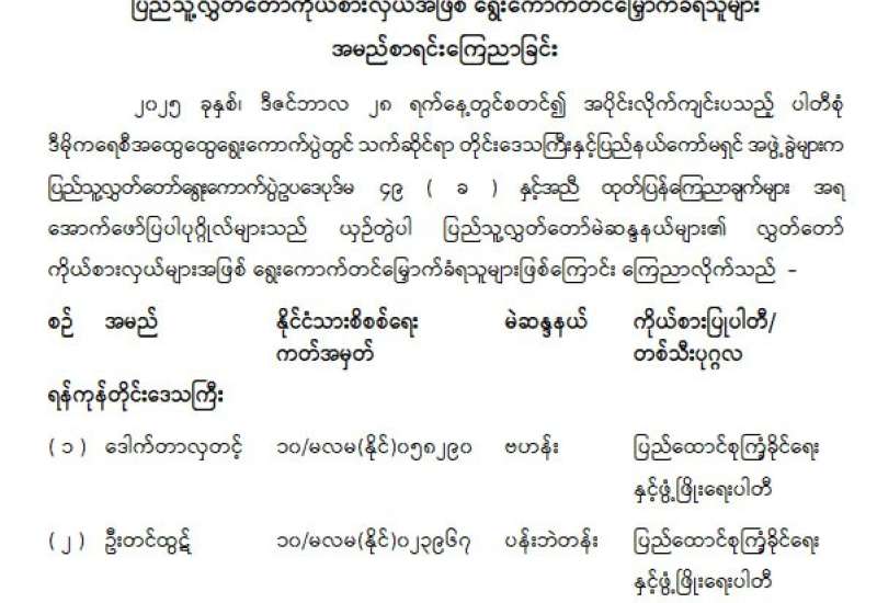 ပြည်သူ့လွှတ်တော်ကိုယ်စားလှယ်အဖြစ် ရွေးကောက်တင်မြှောက်ခံရသူများ အမည်စာရင်းကြေညာခြင်း