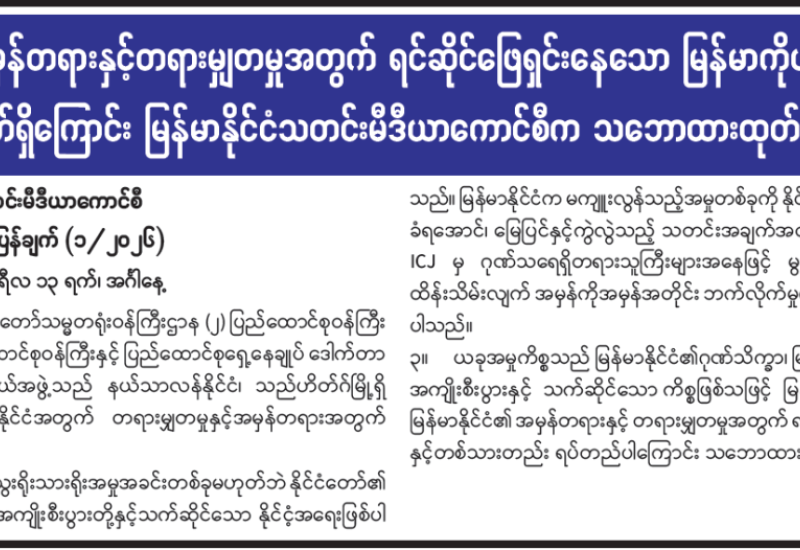 မြန်မာနိုင်ငံ၏ အမှန်တရားနှင့်တရားမျှတမှုအတွက် ရင်ဆိုင်ဖြေရှင်းနေသော မြန်မာကိုယ်စားလှယ်အဖွဲ့နှင့် တစ်သားတည်းရပ်တည်လျက်ရှိကြောင်း မြန်မာနိုင်ငံသတင်းမီဒီယာကောင်စီက သဘောထားထုတ်ပြန်ချက် ထုတ်ပြန်ကြေညာ