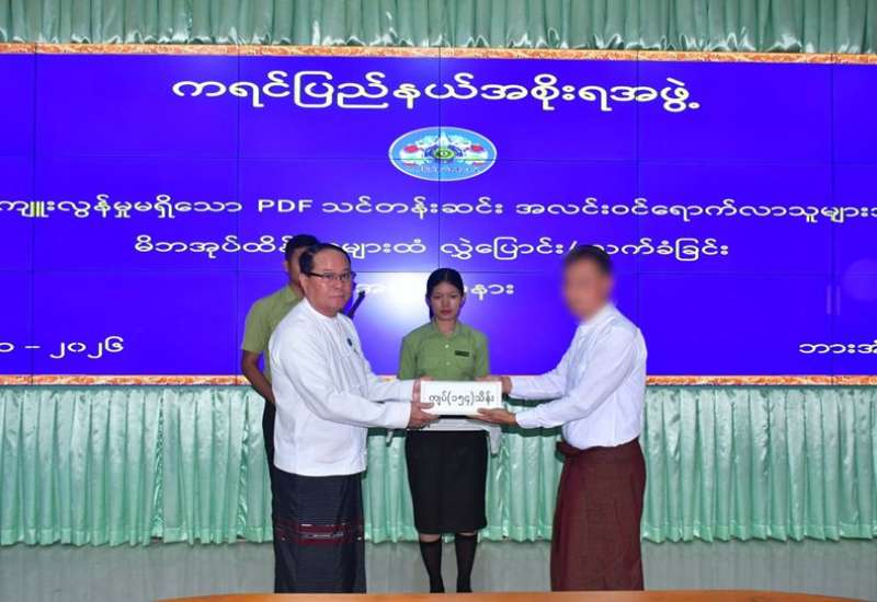 နိုင်ငံတော်အစိုးရသည် PDF အပါအဝင် အဖွဲ့အစည်းအမျိုးမျိုးအမည်ခံ၍ လက်နက်ကိုင်ဆန့်ကျင်လျက်ရှိသည့် အဖွဲ့အစည်းများအတွင်း ရောက်ရှိနေသူများအား ဥပဒေဘောင်အတွင်းသို့ ပြန်လည်ဝင်ရောက်ရန် ဖိတ်ခေါ်၍ ဥပဒေဘောင်အတွင်းသို့ ပြန်လည်ဝင်ရောက်လာကြသူများကိုလည်း လိုအပ်သည့် ကူညီပံ့ပိုးမှုများဆောင်ရွက်ပေးလျက်ရှိရာ နိုင်ငံတော်နှင့် တပ်မတော်၏ ငြိမ်းချမ်းရေးလုပ်ငန်းစဉ်များကို နားလည်သဘောပေါက်လာသည့် PDF အမည်ခံအဖွဲ့ဝင် အမျိုးသား(၅)ဦးတို့သည် လက်နက်၊ ခဲယမ်းများနှင့်အတူ ယနေ့တွင် ဥပဒေဘောင်အတွင်းသို့ ဝင်ရောက်လာကြသည်။