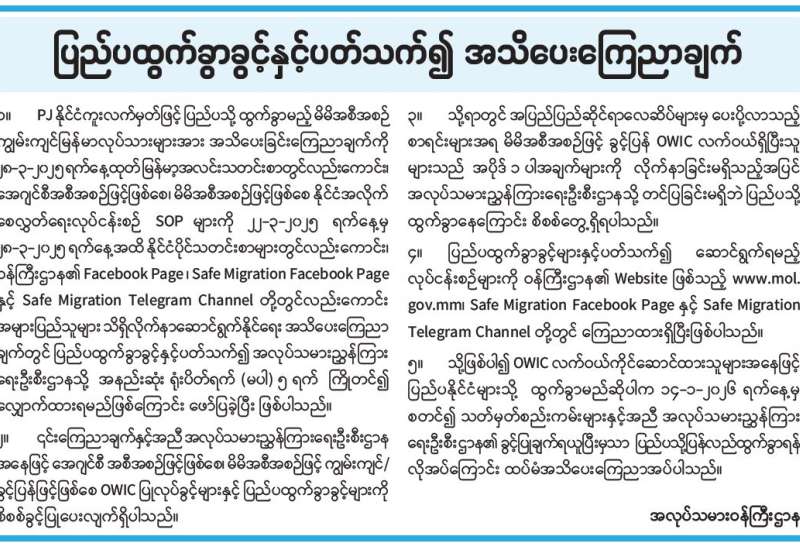 ပြည်ပထွက်ခွာခွင့်နှင့်ပတ်သက်၍ အသိပေးကြေညာချက်