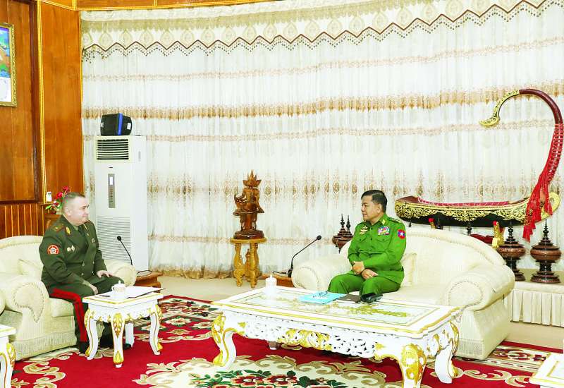ကာကွယ်ရေးဝန်ကြီးဌာန ပြည်ထောင်စုဝန်ကြီး ဗိုလ်ချုပ်ကြီး မောင်မောင်အေးအား ဘယ်လာရုစ်ကာကွယ်ရေးဝန်ကြီးဌာန နိုင်ငံတကာစစ်ဘက် ပူးပေါင်းဆောင်ရွက်ရေးဌာနကြီး၏ အကြီးအကဲနှင့် လက်ထောက်ကာကွယ်ရေးဝန်ကြီး Major General Valeriy Aleksandrovich Revenko က ယနေ့မွန်းလွဲပိုင်းတွင် ပြည်ထောင်စုဝန်ကြီးရုံး ဧည့်ခန်းမ၌ ဂါရဝပြုလာရောက်တွေ့ဆုံသည်။