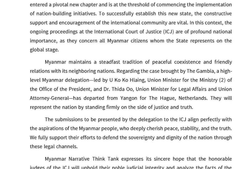 ရန်ကုန်မြို့၊ ၂၀၂၆ ခုနှစ်၊ ဇန်နဝါရီလ ၁၂ ရက် – မြန်မာနိုင်ငံသည် ရွေးကောက်ပွဲအပြီးတွင် သမိုင်းစာမျက်နှာအသစ်သို့ ကူးပြောင်းကာ နိုင်ငံတော်သစ် တည်ဆောက်ရေးလုပ်ငန်းစဉ်များကို စတင်ဖော်ဆောင်တော့မည့်အချိန်အခါဖြစ်ပါသည်။ ထိုသို့ နိုင်ငံသစ်တစ်ရပ်ကို အောင်မြင်စွာ တည်ဆောက်နိုင်ရန်အတွက် နိုင်ငံတကာအသိုက်အဝန်း၏ အပြုသဘောဆောင်သော အားပေးကူညီမှုများနှင့် ပူးပေါင်းဆောင်ရွက်မှုများသည် အထူးလိုအပ်လျက်ရှိပါသည်။ လက်ရှိတွင် အပြည်ပြည်ဆိုင်ရာတရားရုံး (ICJ) ၌ ရင်ဆိုင်နေရသော အမှုကိစ္စသည် မြန်မာနိုင်ငံကို ကိုယ်စားပြုသည့်အပြင် မြန်မာပြည်သူအားလုံး၏ အကျိုးစီးပွားနှင့် တိုက်ရိုက်သက်ဆိုင်သည့် ကိစ္စရပ်တစ်ခုလည်း ဖြစ်ပါသည်။