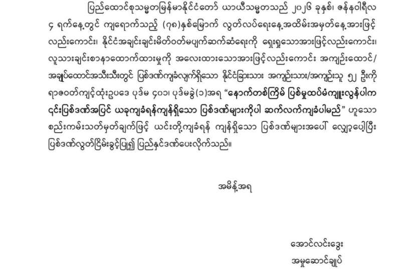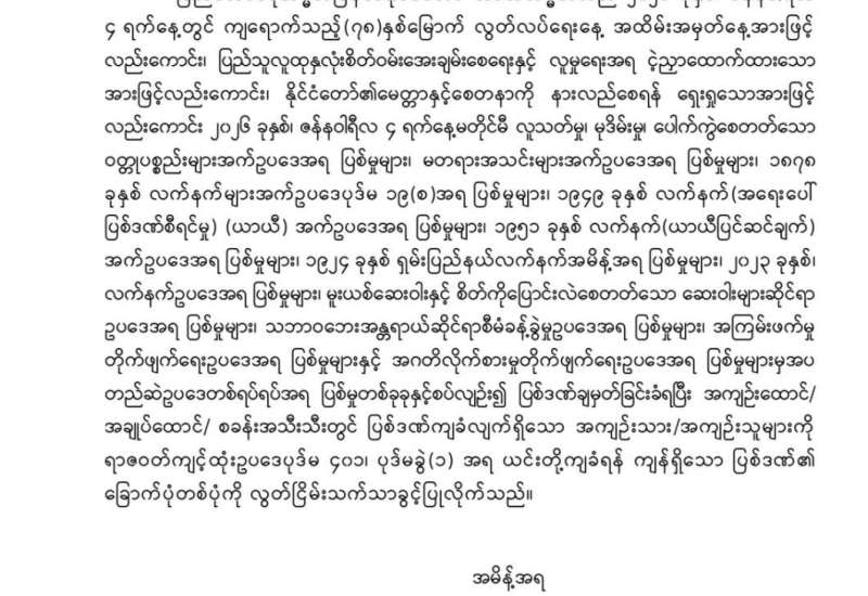 ပြည်ထောင်စုသမ္မတမြန်မာနိုင်ငံတော်၊ အမျိုးသားကာကွယ်ရေးနှင့်လုံခြုံရေးကောင်စီသည် ယနေ့တွင်ကျရောက်သည့် (၇၈) နှစ်မြောက် လွတ်လပ်ရေးနေ့အထိမ်းအမှတ်နေ့ကို ဂုဏ်ပြုသောအားဖြင့် ပြည်သူလူထုနှလုံးစိတ်ဝမ်းအေးချမ်းစေရန်နှင့် လူမှုရေးအရ ငဲ့ညှာထောက်ထားပြီး နိုင်ငံတော်၏ မေတ္တာနှင့် စေတနာကိုနားလည်စေရန်ရှေးရှု၍ ၂ဝ၂၆ ခုနှစ်၊ ဇန်နဝါရီလ ၄ ရက်နေ့မတိုင်မီ လူသတ်မှု၊ မုဒိမ်းမှု၊ ပေါက်ကွဲစေတတ်သော ဝတ္တုပစ္စည်းများအက်ဥပဒေအရ ပြစ်မှုများ၊ မတရားအသင်းများအက်ဥပဒေအရ ပြစ်မှုများ၊ ၁၈၇၈ ခုနှစ် လက်နက်များ အက်ဥပဒေပုဒ်မ ၁၉(စ)အရ ပြစ်မှုများ၊ ၁၉၄၉ ခုနှစ် လက်နက် (အရေးပေါ် ပြစ်ဒဏ်စီရင်မှု) (ယာယီ) အက်ဥပဒေအရ ပြစ်မှုများ၊ ၁၉၅၁ ခုနှစ် လက်နက် (ယာယီပြင်ဆင်ချက်) အက်ဥပဒေအရ ပြစ်မှုများ၊ ၁၉၂၄ ခုနှစ် ရှမ်းပြည်နယ်လက်နက်အမိန့်အရ ပြစ်မှုများ၊ ၂ဝ၂၃ ခုနှစ်၊ လက်နက်ဥပဒေအရ ပြစ်မှုများ၊ မူးယစ်ဆေးဝါးနှင့် စိတ်ကိုပြောင်းလဲစေတတ်သော ဆေးဝါးများဆိုင်ရာ ဥပဒေအရပြစ်မှုများ၊ သဘာဝဘေးအန္တရာယ်ဆိုင်ရာစီမံခန့်ခွဲမှုဥပဒေအရ ပြစ်မှုများ၊ အကြမ်းဖက်မှုတိုက်ဖျက်ရေး ဥပဒေအရပြစ်မှုများနှင့် အဂတိလိုက်စားမှု တိုက်ဖျက်ရေးဥပဒေအရ ပြစ်မှုများမှအပ တည်ဆဲဥပဒေတစ်ရပ်ရပ်အရ ပြစ်မှုတစ်ခုခုနှင့်စပ်လျဉ်း၍ ပြစ်ဒဏ်ချမှတ်ခြင်းခံရပြီး အကျဉ်းထောင်/ အချုပ်ထောင်/ စခန်းအသီးသီးတွင် ပြစ်ဒဏ်ကျခံလျက်ရှိသော အကျဉ်းသား/အကျဉ်းသူများကို ရာဇဝတ်ကျင့်ထုံးဥပဒေပုဒ်မ ၄၀၁၊ ပုဒ်မခွဲ(၁) အရ ယင်းတို့ကျခံရန် ကျန်ရှိသောပြစ်ဒဏ်၏ ခြောက်ပုံတစ်ပုံကို လွတ်ငြိမ်းသက်သာခွင့်အားလည်းကောင်း၊ နိုင်ငံတစ်ဝန်းရှိ အကျဉ်းထောင်/ အချုပ်ထောင်/စခန်းအသီးသီးတွင် ပြစ်ဒဏ်ကျခံလျက်ရှိသော အကျဉ်းသား/ အကျဉ်းသူ ၆၁၃၄ ဦးကို ရာဇဝတ်ကျင့်ထုံးဥပဒေပုဒ်မ ၄၀၁၊ ပုဒ်မခွဲ(၁)အရ “နောက်တစ်ကြိမ် ပြစ်မှုထပ်မံကျူးလွန်ပါက ၎င်းပြစ်ဒဏ်အပြင် ယခုကျခံရန် ကျန်ရှိသော ပြစ်ဒဏ်များကိုပါ ဆက်လက်ကျခံပါမည်" ဟူသော စည်းကမ်းသတ်မှတ်ချက်ဖြင့် ယင်းတို့ကျခံရန်ကျန်ရှိသော ပြစ်ဒဏ်များအပေါ် လျှော့ပေါ့၍ ပြစ်ဒဏ်လွတ်ငြိမ်းခွင့်ပြုလိုက်ကြောင်း သိရှိရသည်။