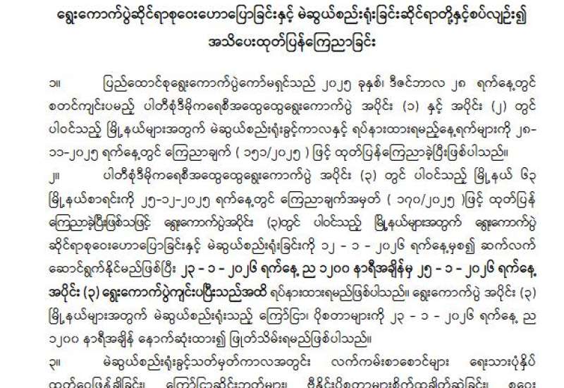 ရွေးကောက်ပွဲဆိုင်ရာစုဝေးဟောပြောခြင်းနှင့် မဲဆွယ်စည်းရုံးခြင်းဆိုင်ရာတို့နှင့်စပ်လျဉ်း၍ အသိပေးထုတ်ပြန်ကြေညာခြင်း