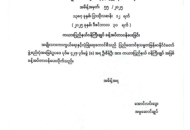ကယားပြည်နယ်ဝန်ကြီးချုပ် ခန့်အပ်တာဝန်ပေးခြင်း