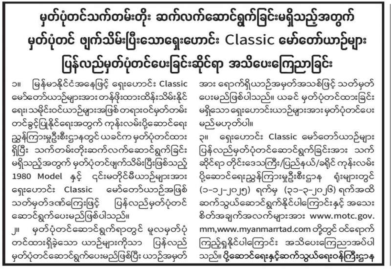 မှတ်ပုံတင်သက်တမ်းတိုး ဆက်လက်ဆောင်ရွက်ခြင်းမရှိသည့်အတွက် မှတ်ပုံတင်ဖျက်သိမ်းပြီးသော ရှေးဟောင်း Classic မော်တော်ယာဉ်များ ပြန်လည်မှတ်ပုံတင်ပေးခြင်းဆိုင်ရာ အသိပေးကြေညာခြင်း