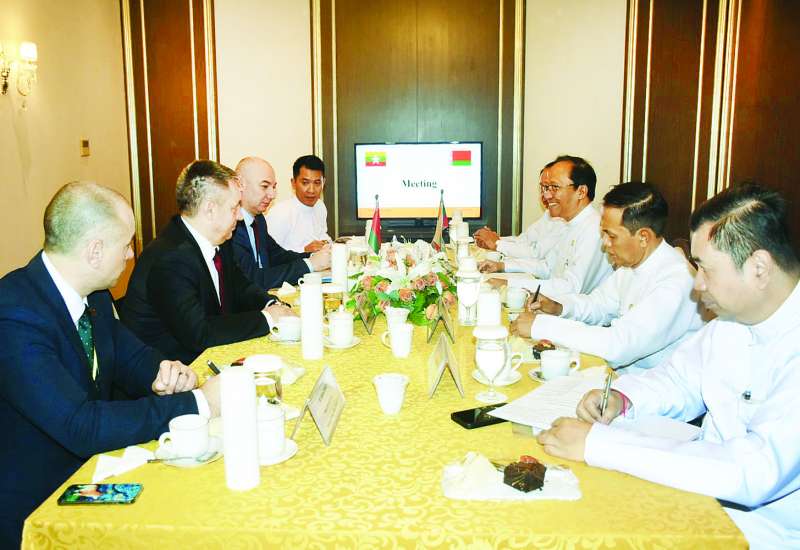 ကျန်းမာရေးဝန်ကြီးဌာန ပြည်ထောင်စုဝန်ကြီး ဒေါက်တာသက်ခိုင်ဝင်းသည် ဘယ်လာရုစ်သမ္မတနိုင်ငံ ကျန်းမာရေးဝန်ကြီး H.E. Mr. Aliaksandr KHAJAYEU နှင့် စိုက်ပျိုးရေးနှင့်စားနပ်ရိက္ခာဆိုင်ရာဝန်ကြီး H.E. Mr. Yury HORLAU တို့ကို ယမန်နေ့မွန်းလွဲပိုင်းက Jasmine Palace Hotel နေပြည်တော်၌ တွေ့ဆုံသည်။