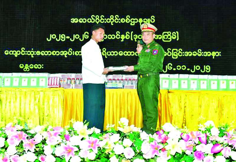 အလယ်ပိုင်းတိုင်းစစ်ဌာနချုပ်နှင့် အဆင့်မြင့်စစ်မှုထမ်းဟောင်းအိမ်ရာ(မန္တလေး)တို့ရှိ ၂၀၂၅-၂၀၂၆ ပညာသင်နှစ်တွင် တက်ရောက်ပညာ သင်ကြားလျက်ရှိသော ကျောင်းသား၊ ကျောင်းသူများအား (ဒုတိယ အကြိမ်) ကျောင်းသုံးဗလာစာအုပ်နှင့် စာရေးကိရိယာ ပေးအပ်ခြင်းကို ယနေ့မွန်းလွဲပိုင်းတွင် အလယ်ပိုင်းတိုင်းစစ်ဌာနချုပ် ရန်အောင်မြင်ခန်းမ၌ပြုလုပ်ရာ တိုင်းမှူးဗိုလ်မှူးချုပ် တင်မင်းလတ်နှင့် တာဝန်ရှိသူများ၊ အရာရှိ၊ စစ်သည် မိသားစုများ၊ စစ်မှုထမ်းဟောင်းအဖွဲ့ဝင်များ၊ ဆရာ၊ ဆရာမများနှင့် ကျောင်းသား ကျောင်းသူများ တက်ရောက်ကြသည်။