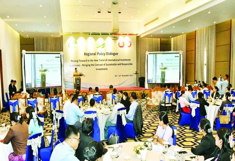 “နိုင်ငံတကာရင်းနှီးမြှုပ်နှံမှုသဘောတူစာချုပ်များ၏ ခေတ်သစ်တိုးတက်မှုလမ်းကြောင်းသို့ ဦးတည်ခြင်း - စဉ်ဆက်မပြတ်သော၊ တာဝန်ယူမှုရှိသော ရင်းနှီးမြှုပ်နှံမှု၏ အယူအဆကို ထည့်သွင်းခြင်း” ဒေသတွင်းအဆင့် မူဝါဒပိုင်းဆိုင်ရာဆွေးနွေးပွဲ ဖွင့်ပွဲအခမ်းအနားကို ယနေ့နံနက်ပိုင်းတွင် နေပြည်တော်ရှိ MGALLERY ဟိုတယ်၌ Hybrid စနစ်ဖြင့် ကျင်းပသည်။