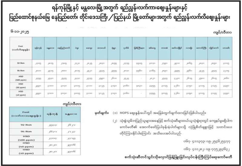 ရန်ကုန်မြို့နှင့် မန္တလေးမြို့အတွက် ရည်ညွှန်းလက်ကားဈေးနှုန်းများနှင့် ပြည်ထောင်စုနယ်မြေ နေပြည်တော်၊ တိုင်းဒေသကြီး/ပြည်နယ် မြို့တော်များအတွက် ရည်ညွှန်းလက်လီဈေးနှုန်းများ