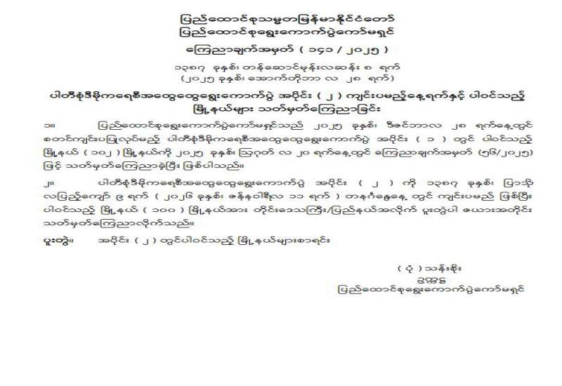 ပါတီစုံဒီမိုကရေစီအထွေထွေရွေးကောက်ပွဲအပိုင်း( ၂ )ကျင်းပမည့် နေ့ရက်နှင့်ပါဝင်သည့်မြို့နယ်များ သတ်မှတ်ကြေညာခြင်း