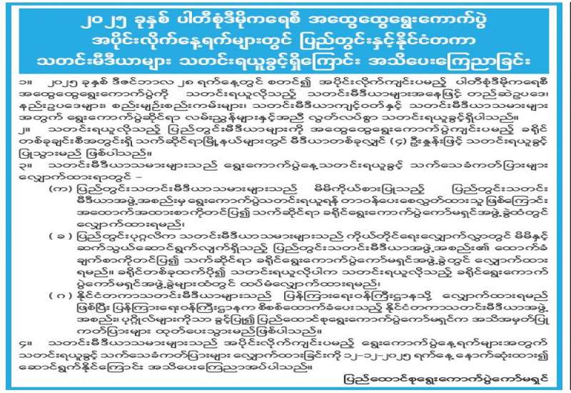 ၂၀၂၅ ခုနှစ် ပါတီစုံဒီမိုကရေစီအထွေထွေရွေးကောက်ပွဲ အပိုင်းလိုက်နေ့ရက်များတွင် ပြည်တွင်းနှင့် နိုင်ငံတကာသတင်းမီဒီယာများ သတင်းရယူခွင့်ရှိကြောင်း အသိပေးကြေညာခြင်း