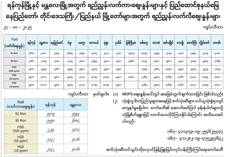 ရန်ကုန်မြို့နှင့် မန္တလေးမြို့အတွက် ရည်ညွှန်းလက်ကားဈေးနှုန်းများနှင့် ပြည်ထောင်စုနယ်မြေနေပြည်တော်၊ တိုင်းဒေသကြီး/ပြည်နယ် မြို့တော်များအတွက် ရည်ညွှန်းလက်လီစျေးနှုန်းများ