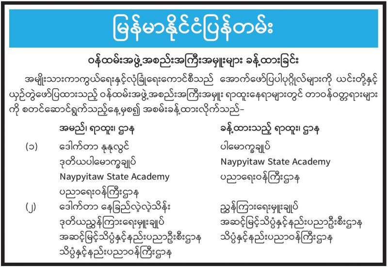 အလယ်အလတ်အဆင့်အရာထမ်း သင်တန်းအမှတ်စဉ်(၁၃) သင်တန်းဆင်းပွဲကို ယနေ့နံနက် ၈ နာရီတွင် နိုင်ငံ့ဝန်ထမ်းတက္ကသိုလ်(အထက်မြန်မာပြည်) ရတနာခန်းမ၌ ကျင်းပရာ ပြည်ထောင်စုရာထူးဝန်အဖွဲ့ဝင် ဦးဆန်းမြင့်၊ နိုင်ငံ့ဝန်ထမ်းတက္ကသိုလ် (အထက်မြန်မာပြည်) ပါမောက္ခချုပ်၊ ဒုတိယပါမောက္ခချုပ်၊ တက္ကသိုလ် သင်ကြား/ စီမံဌာနများမှ တာဝန်ရှိပုဂ္ဂိုလ်များနှင့် သင်တန်းသားသင်တန်းသူများ တက်ရောက်ကြသည်။